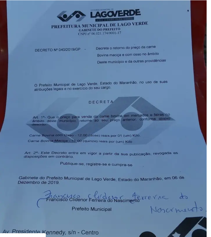 O prefeito Francisco Clidenor (Cidadania), de Lago Verde, no interior do Maranhão, baixou decreto para fixar o preço da carne bovina nos açougues de sua cidade de cerca de 16 mil habitantes. Na canetada ele decidiu que a carne com osso não pode ser vendida acima de R$ 12 o quilo, enquanto a maciça não pode ultrapassar R$ 15.